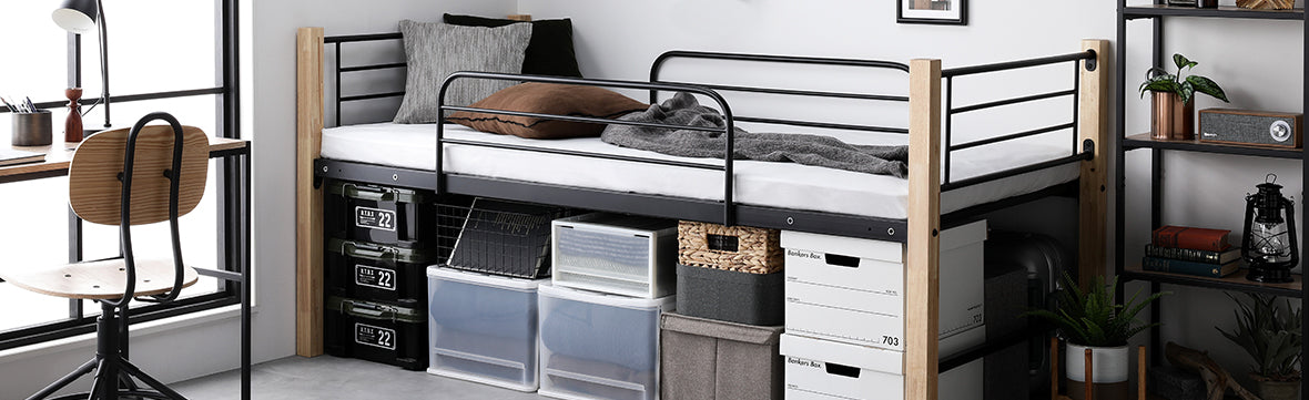 お部屋を広く使えるロフトベッドは、子ども部屋やワンルーム等を省スペースに使いたい方に人気のベッド。機能性に優れ、勉強や遊びに最適な空間を作れます。ひとり暮らしやシェアハウスの寝室、子ども部屋などのレイアウトにおすすめです。