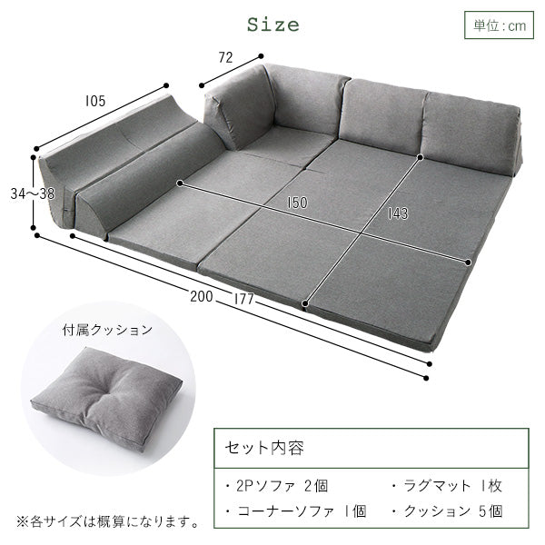 - 2Pソファ 2個、コーナーソファ 1個、ラグマット 1枚、クッション 5個(リバーシブル)