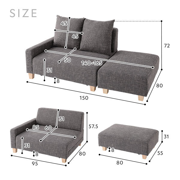 - 1.5人掛け:(約)幅95cm×奥行80cm(座面奥行:60cm)×高さ57.5cm(脚高さ:8cm)