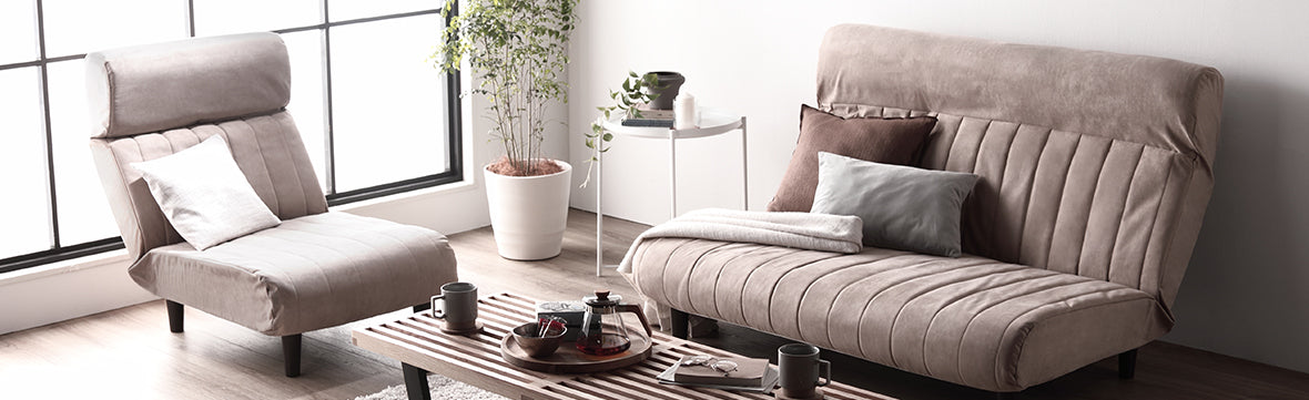 背面の高いハイバックソファは体を預けやすく、首や肩の負担を抑えやすいのが特徴。RASIKでは、リクライニング機能を備えた商品もお選びいただけます。