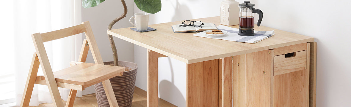 畳んで収納できる折りたたみテーブルは、ワンルームでも使いやすいコンパクトな商品。書斎や窓際に置いて、一時的な作業スペースとして使うのもおすすめです。