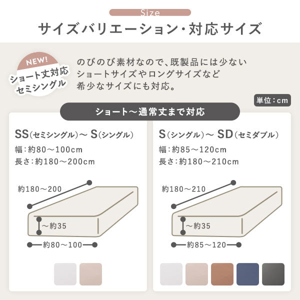 ・SS(セミシングル)~S(シングル):幅約80~100×長さ約180~200×厚み~約35cm ※ホワイト・グレージュのみの展開になります。