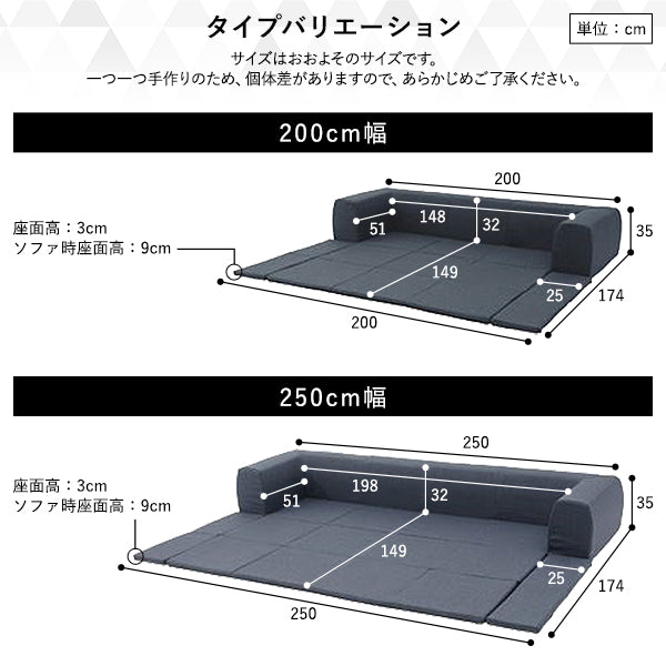 - Lサイズ:(約)幅250cm×奥行76cm~174cm×高さ35cm、座面高さ:3~9cm
