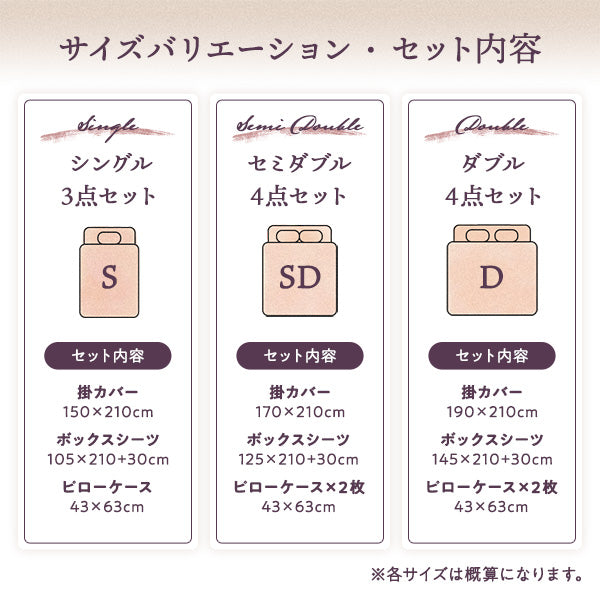 - ※セミダブル(4点セット)・ダブル(4点セット)は全カラー完売いたしました。再入荷の予定はございませんので、あらかじめご了承ください。