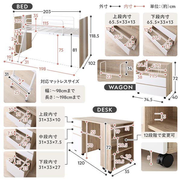 - ※こちらは『システムベッド3点セット(ベッド+デスク+ワゴン)』の商品ページです。