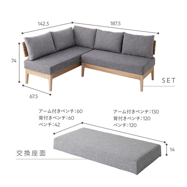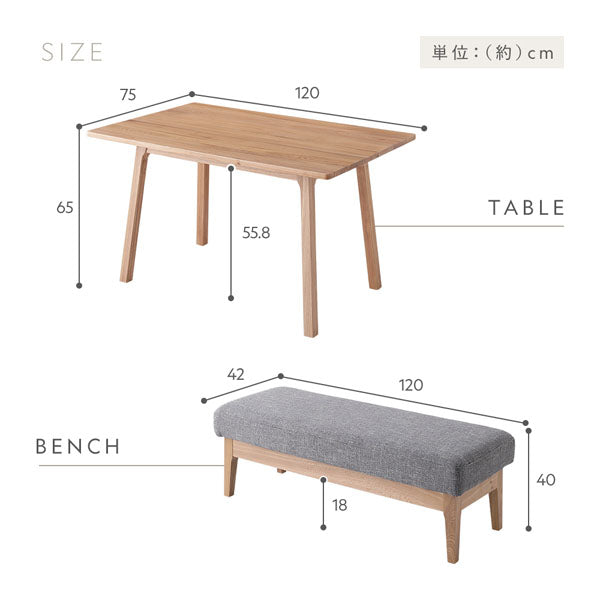 - ベンチ:張り材:ポリエステル100%/クッション材:ウレタンフォーム/構造部材:天然木(ニレ)/表面加工:ウレタン樹脂塗装