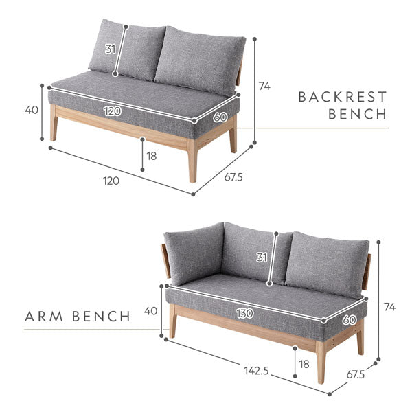 - 背付きベンチ:(約)幅120×奥行67.5×高さ74cm ※クッション含む(座面高40cm)
