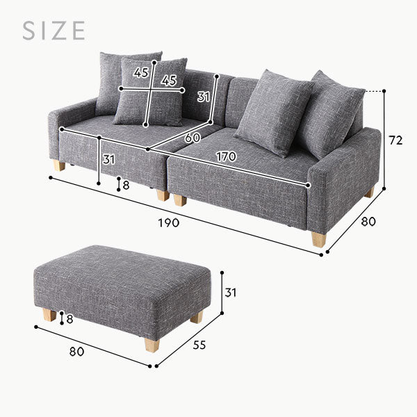 - 3人掛け:(約)幅190cm×奥行80cm(座面奥行:60cm)×高さ57.5cm(脚高さ:8cm)※クッションを含めた高さ72cm
