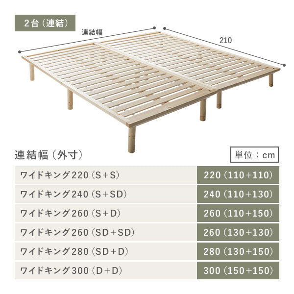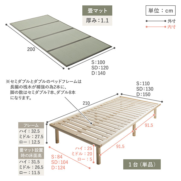 - ※ワイドキングサイズのベッドフレームには、それぞれ2台ずつ畳マットがセットされています。2台を並べてご使用ください。(例:ワイドキング220cm(S+S)のベッドフレームには、Sサイズの畳マット2台がセットされています。)
