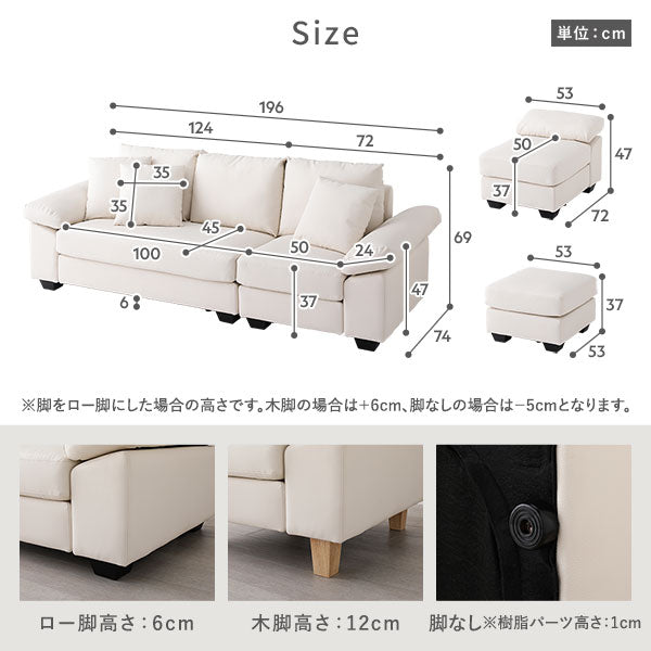 - 3人掛け:(約)幅196×奥行74×高さ69cm(背もたれクッション含む)