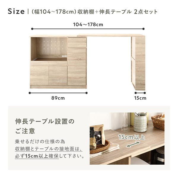 (幅104~178cm)置き場所にあわせて調節できる、伸長式テーブル付きキッチン収納 2点セット ナチュラル