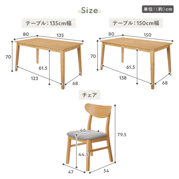 - 5点セット(テーブル135cm幅+チェア4脚)約:(1)約141×87×12cm・25.8kg、(2)約70×49×93cm・14.6kg、(3)約70×49×93cm・14.6kg