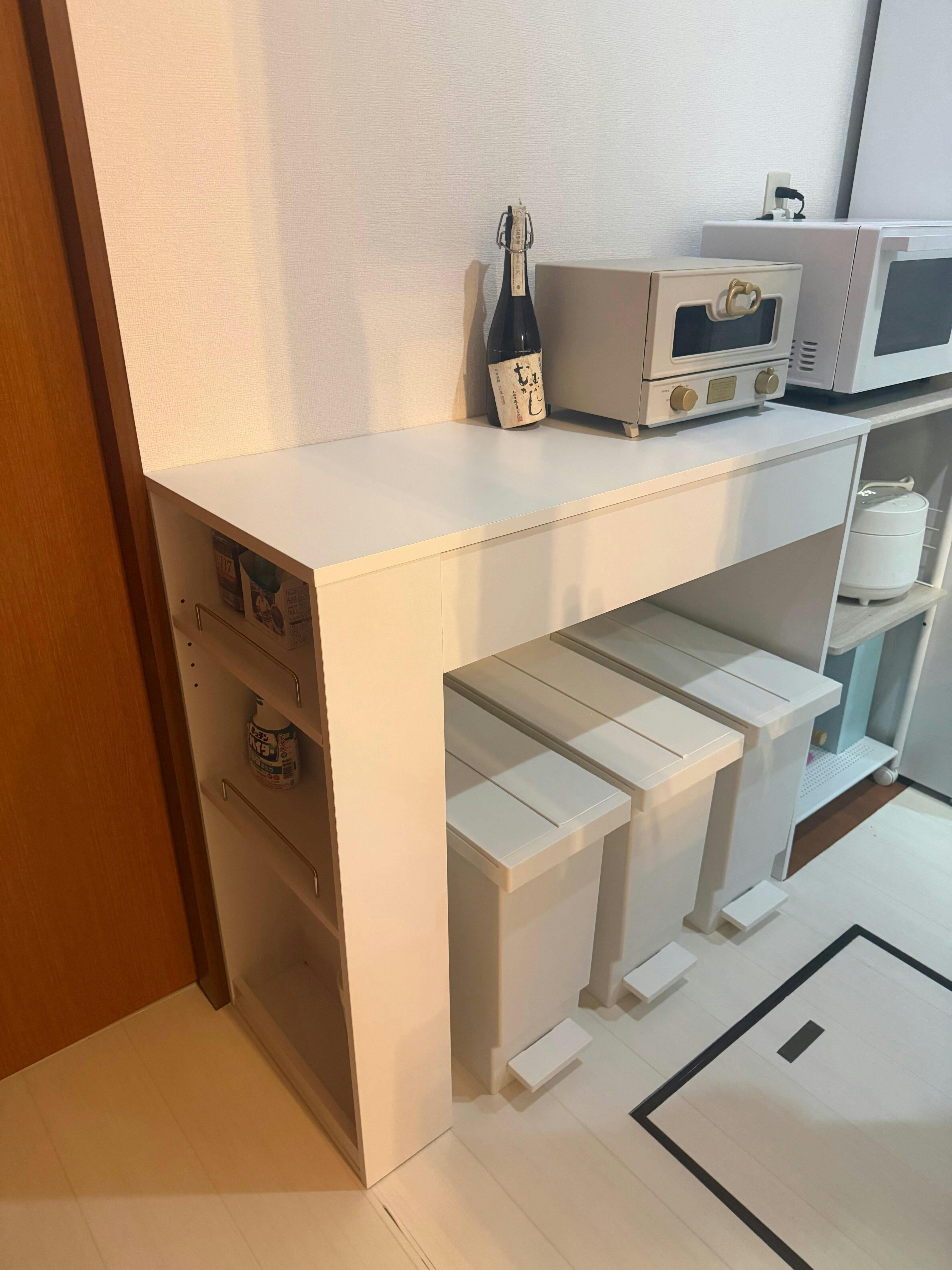 デッドスペースになりがちなゴミ箱の上を便利に無駄なく使える収納棚。
