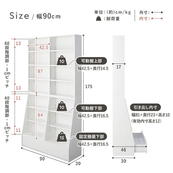 関連キーワード:高さ175cm 引き出し付き本棚 薄型ブックシェルフ ハイタイプ 幅60cm 幅90cm 60cm幅 90cm幅 引出し収納 引き出し収納 引き出し 薄型 スリム シェルフ ブックラック ブックシェルフ 本棚 大容量収納 可動棚 HIGH TYPE スライドレール 子ども部屋 書斎 横揺れ防止対策 転倒防止対策 ホワイト ナチュラル ダークブラウン