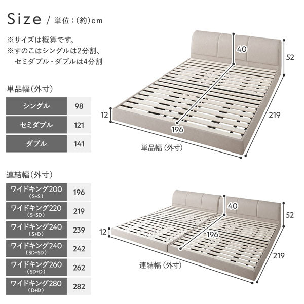 - マットレス付きワイドキングをご購入の場合、フレームとマットレスが2台ずつセットされています。2台を並べてご使用ください。(例:マットレス付きワイドキング200(S+S)には、Sサイズのフレーム2台とSサイズのマットレス2台がセットされています。)